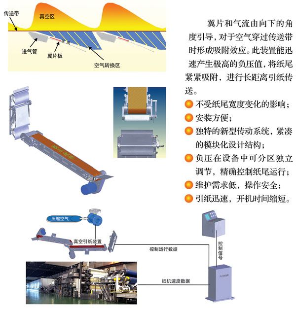 该设备是由于气翼技术使传送带表面产生负压,将运行中的纸尾紧紧吸附在传送带上。技术原理是传送带下方的翼片吹送压缩空气所产生的气翼效应。这种气翼效应可保证该引纸设备以少的空气和能耗量产生极高的负压值。